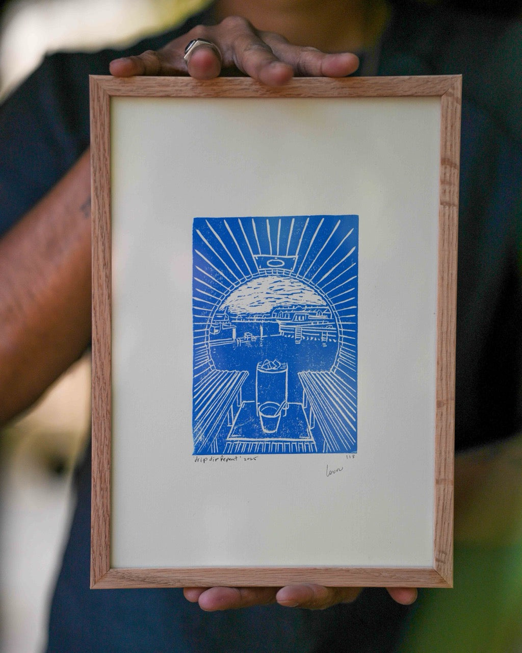 Each print is individually hand-pressed numbered & singed by Isuru, making every piece unique. 10cmx5cm print on A4 paper with a striking blue print, subtle variations add to its character and craftsmanship. A reflection of La Banchina’s atmosphere, captured in art.