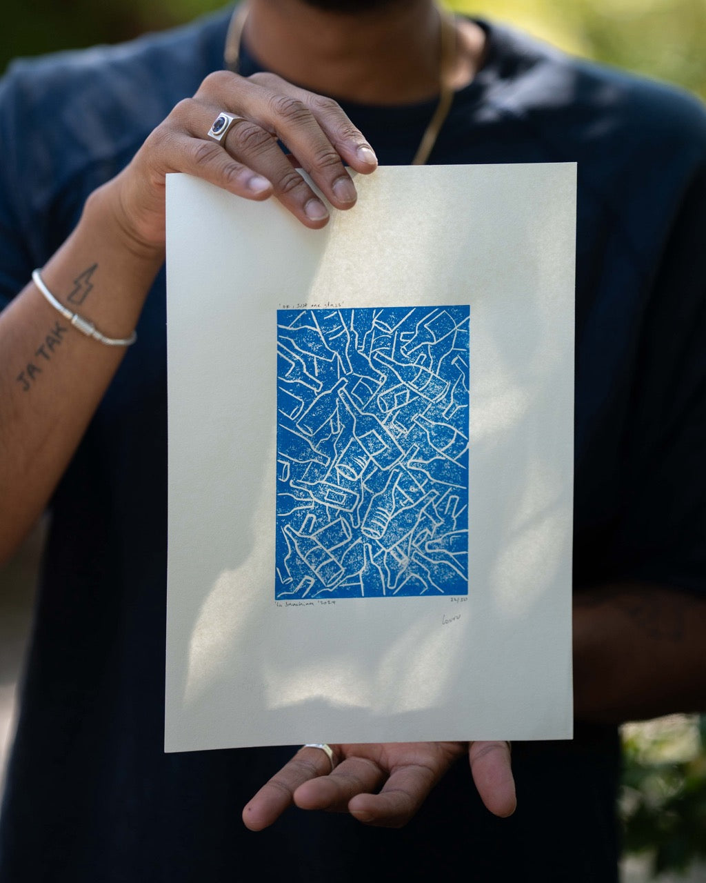 Each print is individually hand-pressed numbered & singed by Isuru, making every piece unique. 10cmx5cm print on A4 paper with a striking blue print, subtle variations add to its character and craftsmanship. A reflection of La Banchina’s atmosphere, captured in art.